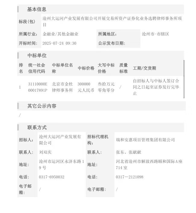 滄州大運河產(chǎn)業(yè)發(fā)展有限公司開展交易所資產(chǎn)證券化業(yè)務(wù)選聘律師事務(wù)所項目